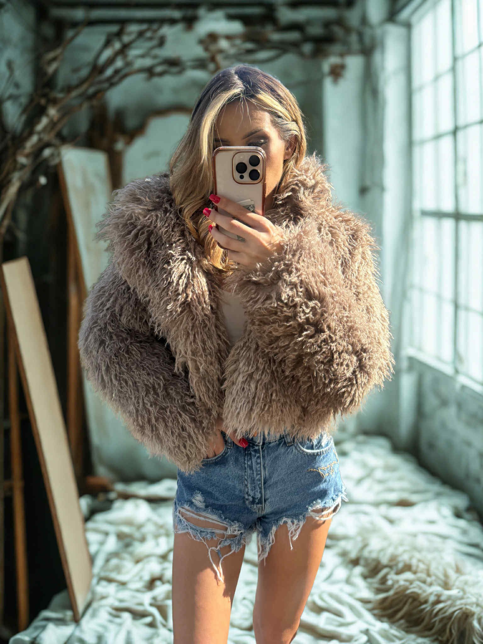 Stylowe i miękkie futerko typu eco lama, które pięknie układa się na sylwetce. Idealne do jesienno-zimowych stylizacji — wygląda świetnie zarówno do jeansów, jak i sukienek.